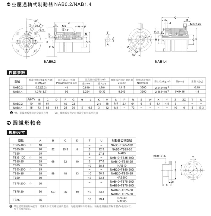 NAB型空壓制動器使用帶楔的圓錐形軸套管往軸上安裝,擁有摩擦板可在保持機械設備原樣的情況下進行交換構造。